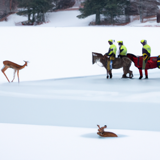 New Hampshire – In a stunning display of heroism, police and firefighters banded together to save a helpless deer that was stranded on the ice in the middle of a large pond. The deer, who had apparently forgotten how to swim, was seen floundering on the ice by a group of passersby who immediately called the authorities.