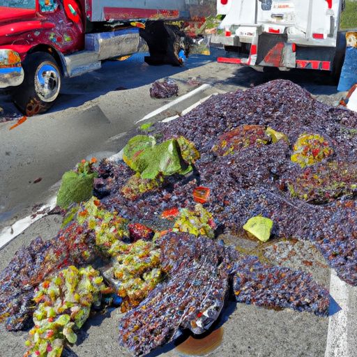 “Grapes of Unroutable Anger: California Commuters Hit Traffic Jam and Vineyard Explosion” California commuters were in for a real treat this week when a semi truck met its unfortunate fate, scattering crushed grapes across a major highway like confetti at a day-drinking festival