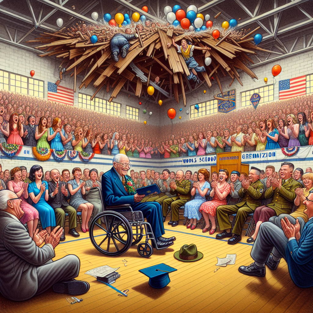 BREAKING: 98-Year-Old WWII Vet’s Diploma Ceremony Brings House Down, Literally! In a jaw-dropping, tear-jerking, and roof-collapsing ceremony, 98-year-old World War II veteran, Harold “The Hero” Harrison, was finally presented with his long-overdue high school diploma from Lincoln High School in Rhode Island yesterday