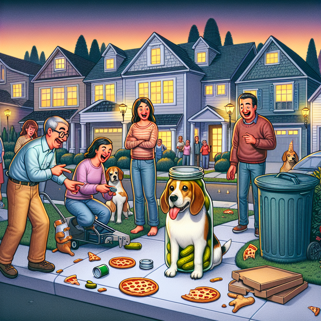 BREAKING: MIRACLE IN SUBURBIA AS CANINE SURVIVOR OF JAR-GATE ORDEAL EMERGES FROM DAYS-LONG ADVENTURE In a stunning turn of events, a brave and bewildered beagle named Balthazar was rescued yesterday evening after being stuck with his head lodged in a giant pickle jar for a whopping 5 DAYS! The drama unfolded in the usually quiet neighborhood of Oakdale, where Balthazar, 3, had managed to get his head wedged in the jar while rummaging through his owner’s trash cans in search of last night’s pizza crusts