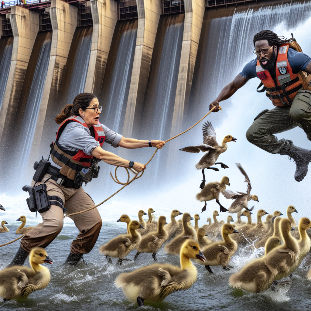 In what can only be dubbed a gripping tale of nature and negligence, a couple of animal care officers recently put their lives—if only for a brief moment—on the line for a gaggle of baby geese that had clearly not received the memo about staying away from hazardous areas. The daring rescue operation, however, took a wild twist as these well-meaning officers found themselves in a conundrum of their own making, trapped beneath the very dam spillway they bravely attempted to conquer.