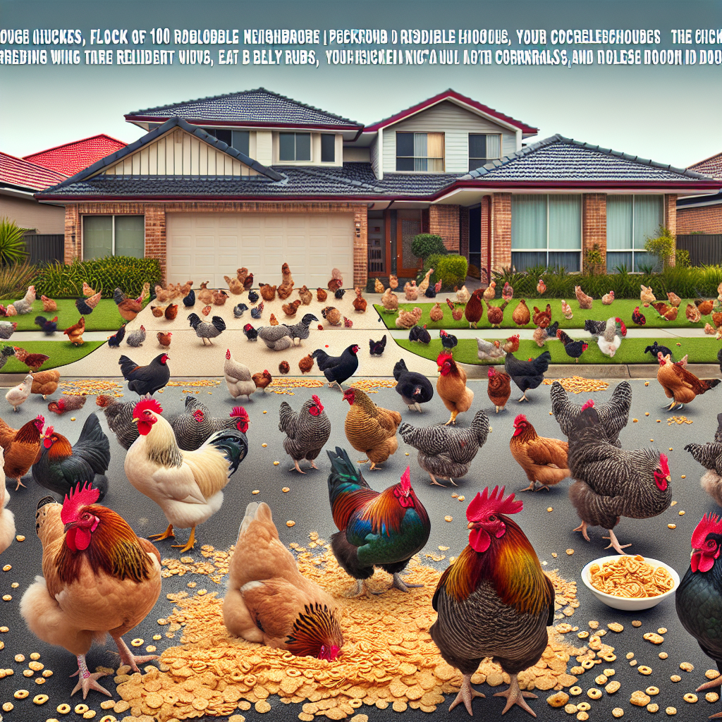 BREAKING: FLOCK OF ROGUE CHICKENS TERRORIZES NEIGHBORHOOD, DEMANDS BELLY RUBS AND CORNFLAKES In a bizarre incident that has left residents scratching their heads, a gang of approximately 100 feral chickens has taken over a quiet suburban street, ruling with an iron wing and refusing to let anyone leave their homes