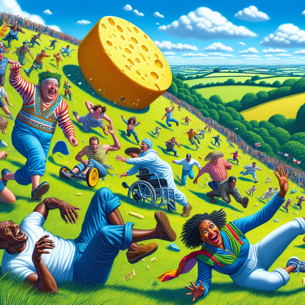 BREAKING: Chaos Erupts as Thrill-Seeking Cheese Fanatics Take to the Hills for Annual Roll-a-Thon In a spectacle that will be etched in the annals of history as one of the most utterly, completely, and totally RIDICULOUS events of the year, hundreds of daredevils converged on the rolling hills of Gloucestershire, England for the infamous Cheese Rolling Festival