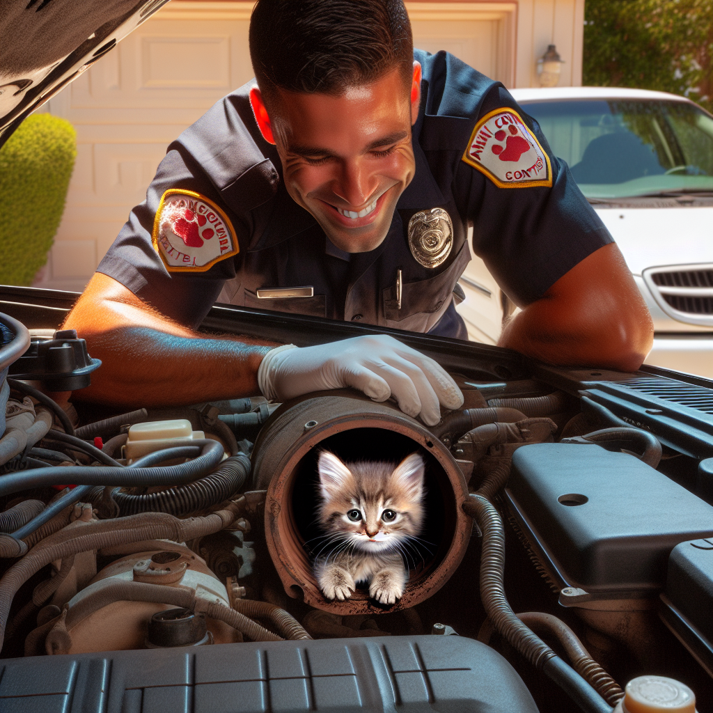 BREAKING: KITTEN’S DEATH-DEFYING 12-INCH JOURNEY ENDS IN MIRACULOUS RESCUE In a daring display of feline bravery, a plucky kitten in Indiana took a wild ride for the ages when it climbed into the engine compartment of an animal control employee’s car, sparking a heart-stopping rescue mission that will leave you on the edge of your seat! According to eyewitnesses, the fearless kitten, estimated to be only 6 months old, somehow managed to squeeze itself into the tiny crevice, a whopping 12 inches from freedom