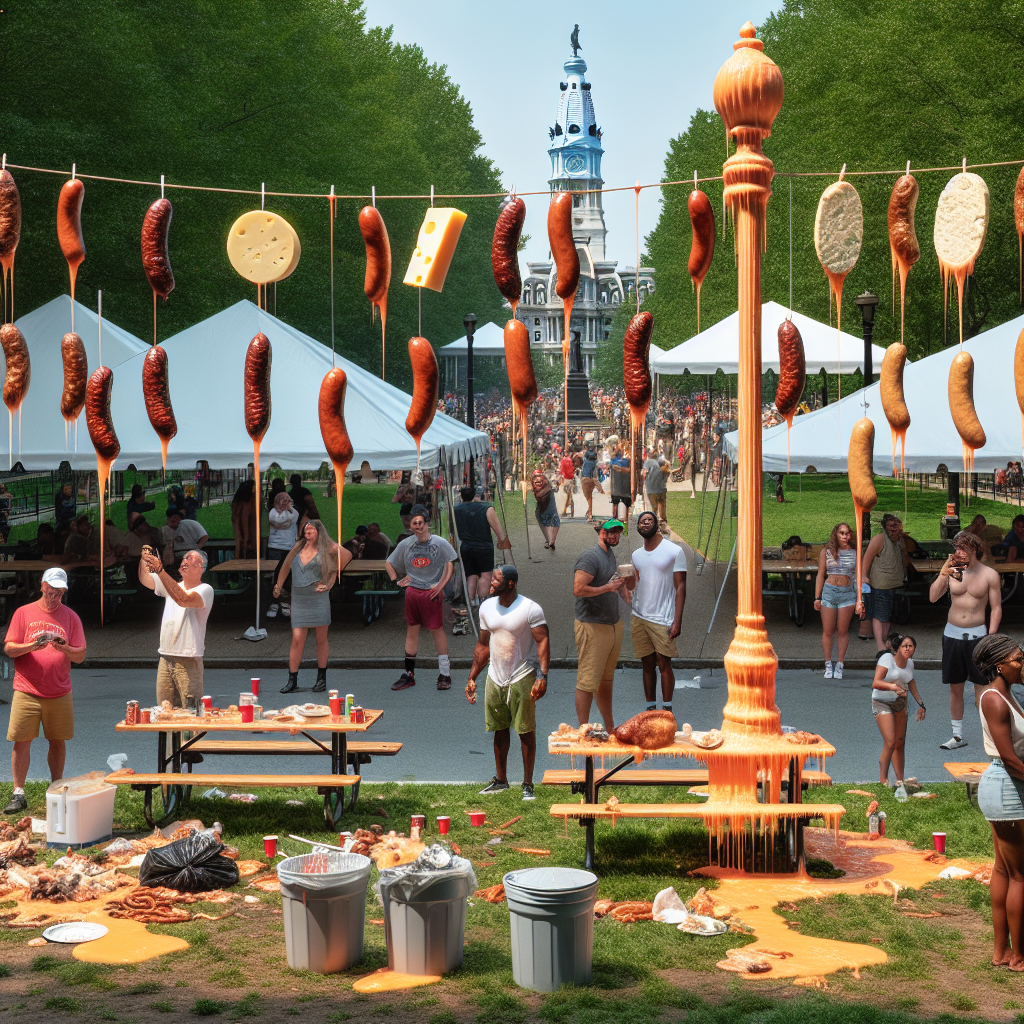 BREAKING: Philly Festival Turns into Bizarre Meat-Hanging Fiasco In a bizarre incident that has left residents and visitors alike scratching their heads, a Philadelphia festival that concluded nearly a month ago has turned into a surreal scene, with meats and cheeses still dangling precariously from a greased pole