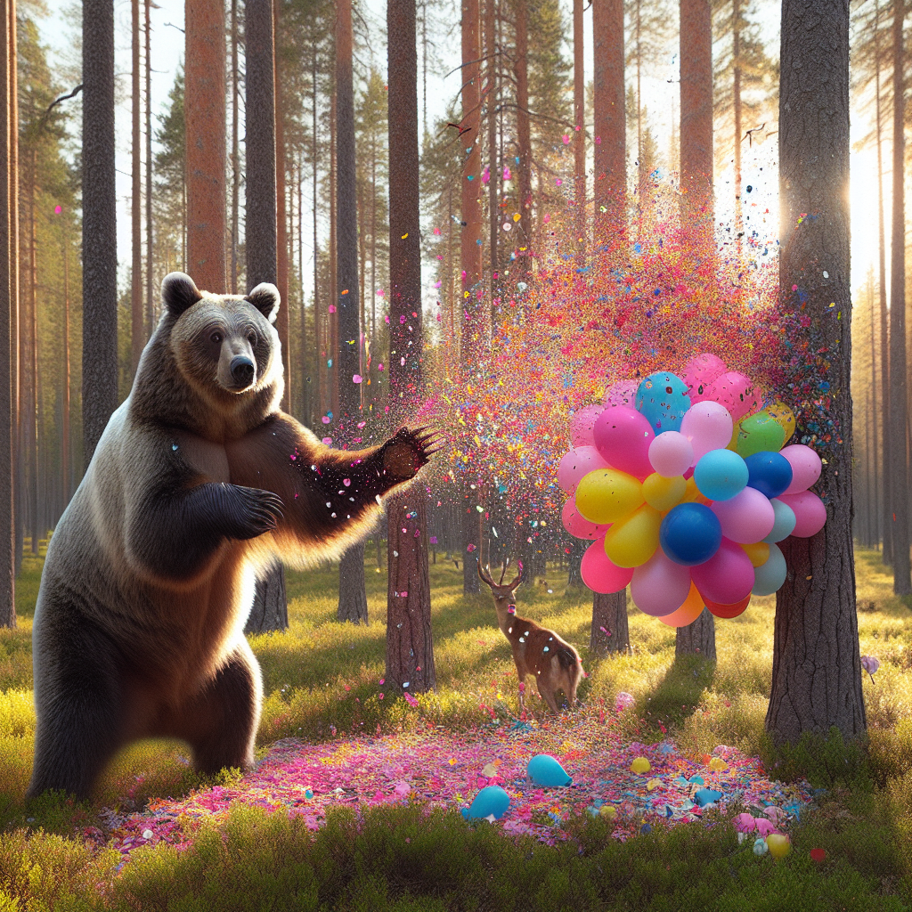 In a flash of furry fury, the bear swipes at the balloon with its massive paw, sending confetti exploding in all directions. The bear then proceeds to dance around the forest, twirling and spinning with pure joy, sending acorns and leaves flying in all directions.