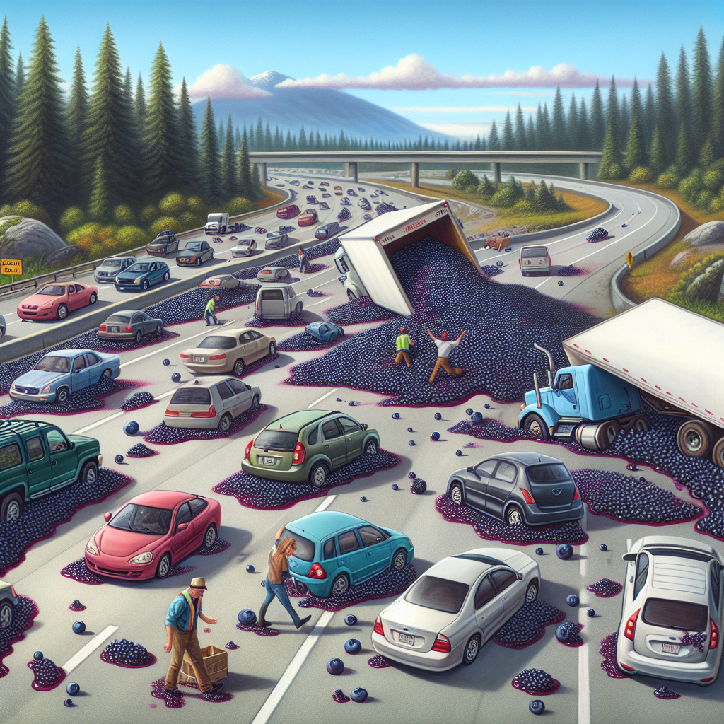 **UPDATE:** The blueberry jam factory has announced plans to offer a special “Traffic Jam” flavor, made from the very blueberries that caused the chaos. Sales are expected to be… well, jam-packed.