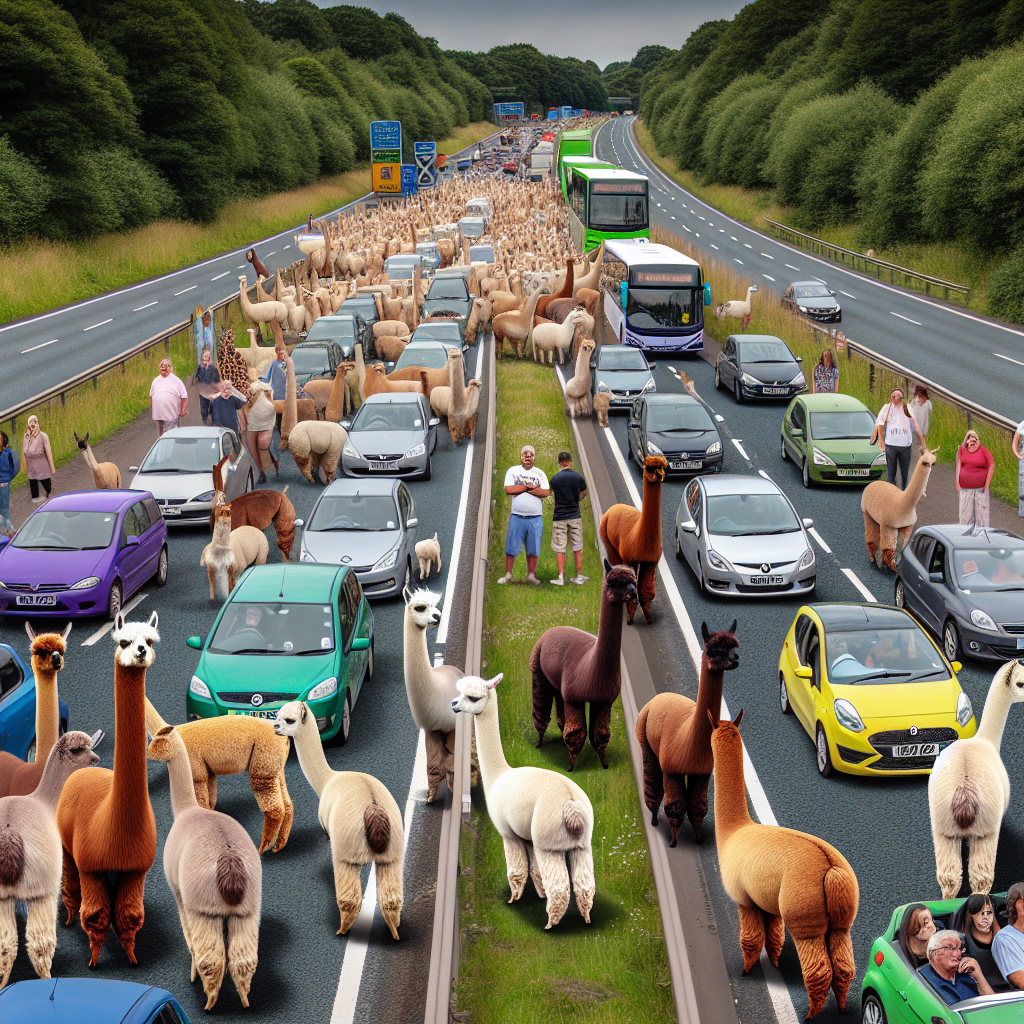 BREAKING: ALPACA INVASION BRINGS ENGLAND TO A STANDSTILL In a bizarre incident that has left motorists fuming, a herd of marauding alpacas has taken over a major highway in England, bringing traffic to a grinding halt