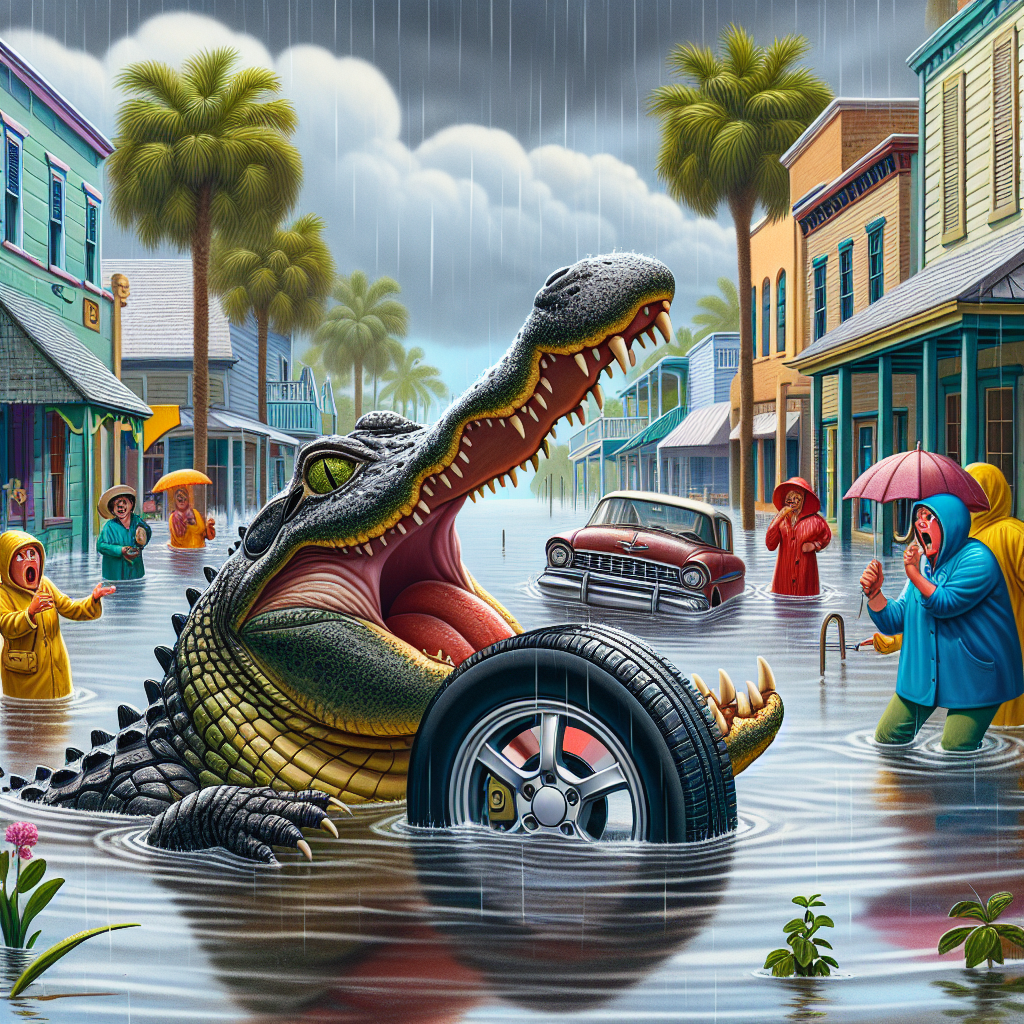 “It was like something out of a monster movie!” exclaimed eyewitness, Jimmy Joe Bob. “I was drivin’ by and saw this huge gator chompin’ down on the tire like it was a chew toy. I slammed on my brakes and nearly ended up in the drink myself!”
